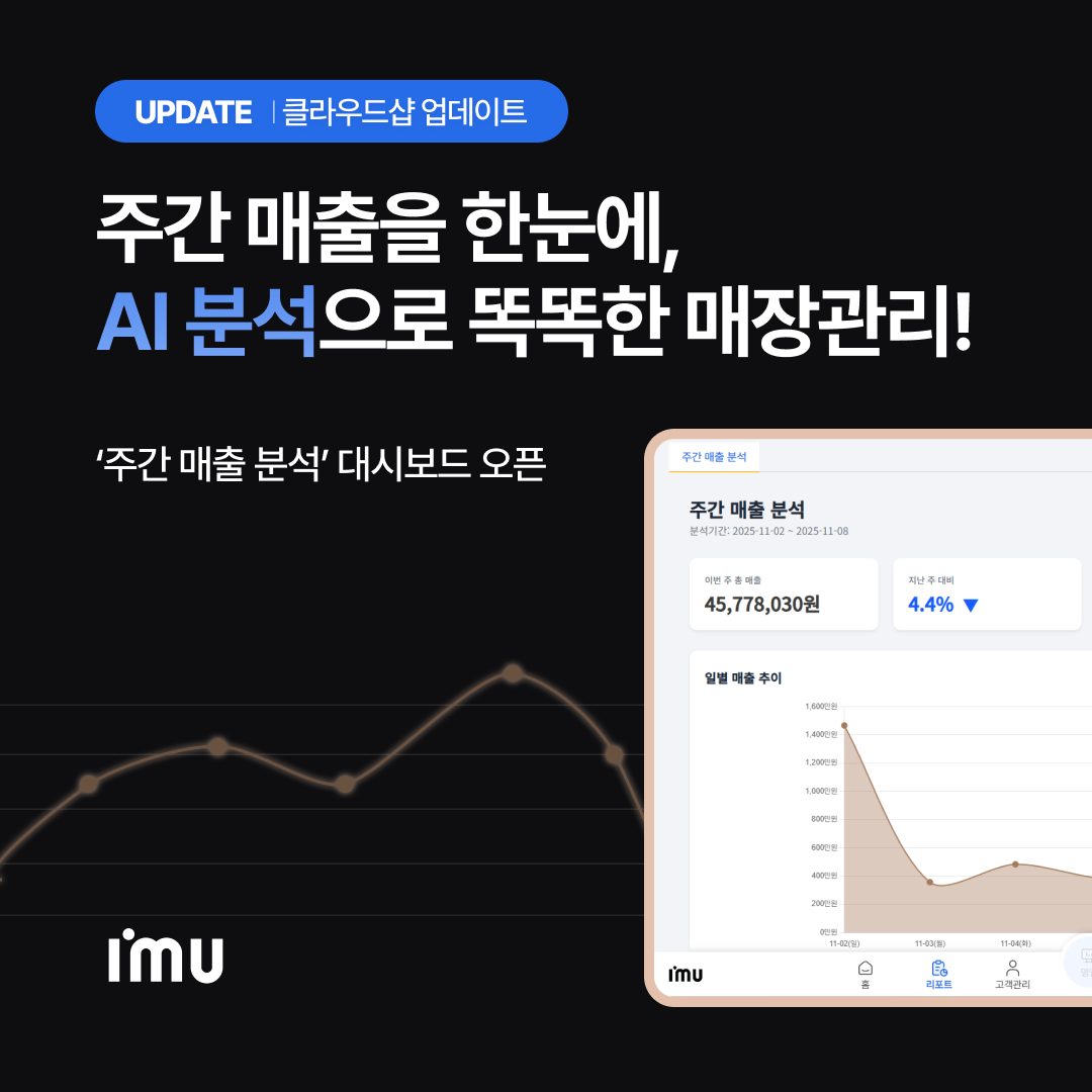 클라우드샵에 ‘주간 매출 분석’ 대시보드가 새로 추가되었습니다. 데이터로 관리하는 주간 매출! 이제 일주일 동안의 매출을 한눈에 보고, 전 주 대비 증감률, 요일별 최고·최저 매출, 그래프 · 표 · 분석진단까지 한 번에 확인하실 수 있어요. ☁️클라우드샵 → 리포트 → 대시보드 → 주간 매출 분석에서 바로 만나보실 수 있습니다. #클라우드샵 #CloudShop #주간매출분석 #매출리포트 #POS리포트 #자영업자필수 #매장운영 #아임유 #아임유포스