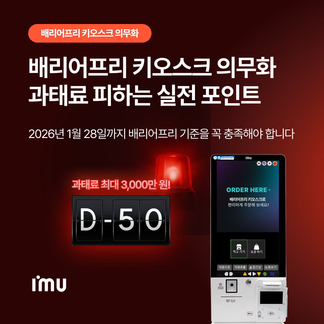 🚨키오스크 쓰고 계신 사장님, 주목해주세요!🚨이제는 ‘배리어프리 키오스크’ 의무까지 챙겨야 하는 시점입니다.2026년 1월 28일까지 우리 매장은✅ NIA 인증 배리어프리 키오스크로 교체하거나✅ 15평 미만 소규모·소상공인 매장은 보조 S/W 또는 보조 인력 상주+호출벨 중 하나를 반드시 갖춰야 최대 3,000만 원 과태료를 피할 수 있어요.제대로 된 아임유 T6B 배리어프리 키오스크 도입하고,과태료 걱정 없이 매장 업그레이드 준비해 보세요.📞상담문의1566-9209📞#배리어프리키오스크 #키오스크의무화 #배리어프리 #키오스크교체 #키오스크설치#장애인접근성 #소상공인 #매장운영 #과태료3000만원 #아임유 #아임유키오스크 #T6B #무장애키오스크