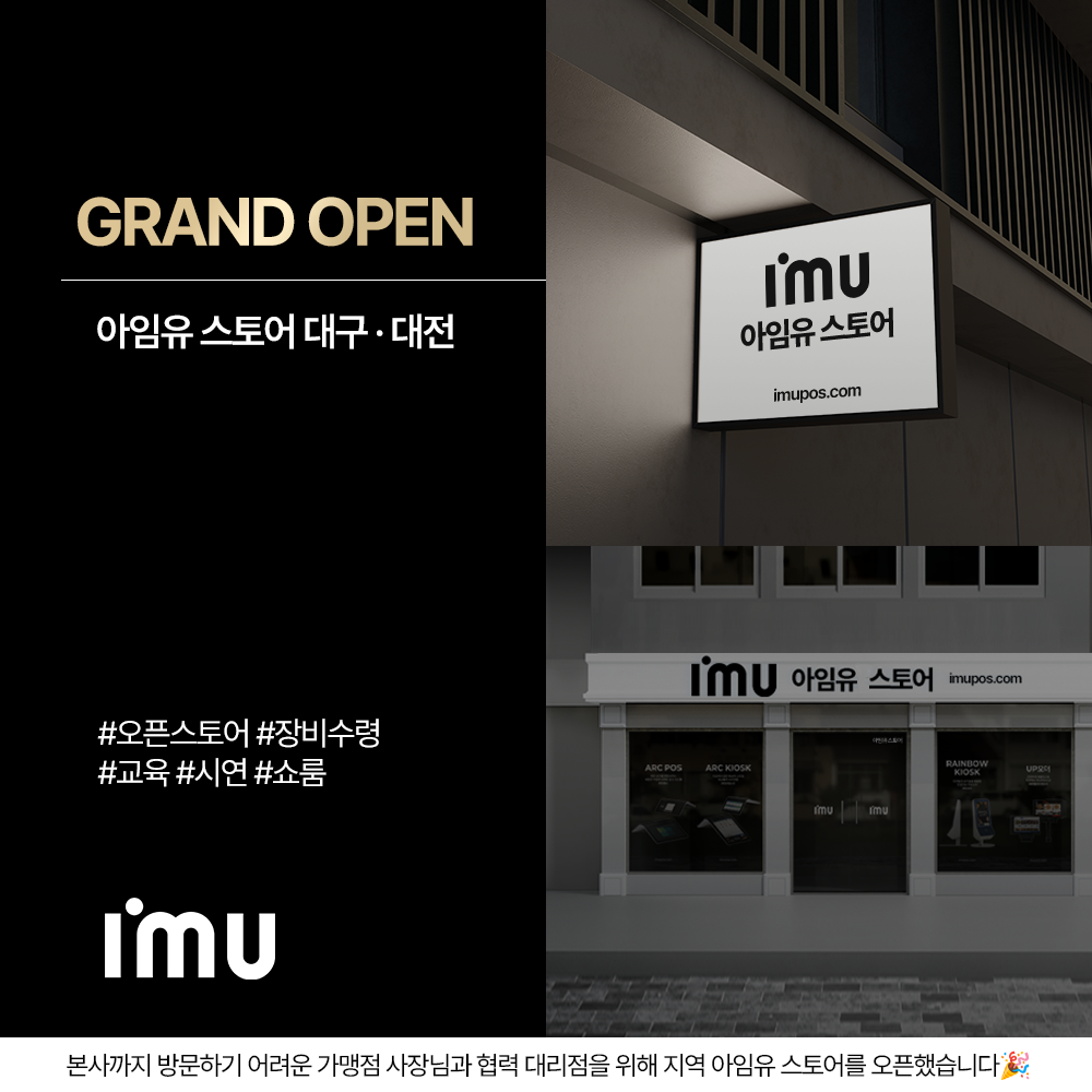 본사까지 방문하기 어려운 가맹점 사장님과 협력 대리점을 위해지역 아임유 스토어를 오픈했습니다🎉아임유 스토어 오픈을 통해 더욱 편리하고 효율적으로서비스를 이용하시길 바랍니다🙏 📌아임유 스토어 대구점: 대구광역시 수성구 달구벌대로 2718 (만촌동) 2층📌아임유 스토어 대전점: 대전광역시 중구 유천로 9 (유천동) 1층대구 · 대전점에서 교육 받고싶으시다면 ?👉신청페이지 바로가기👉 📝 https://imupos.com/kr/sub/support/edu/