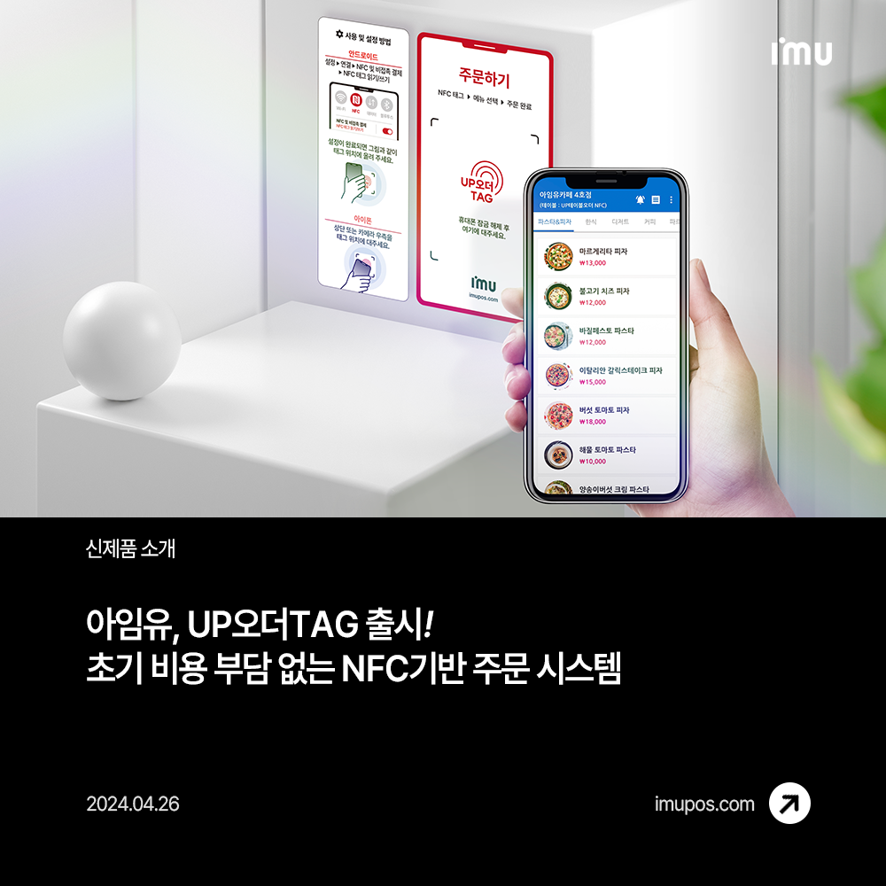 [신제품 소개] 아임유, UP오더 TAG 출시!UP오더 TAG란?"초기 비용 부담 없는 보안과 편리성이 강화된 NFC 기반 주문 시스템입니다."고객이 NFC태그에 휴대폰을 가까이 대면메뉴판이 바로 표시되어 빠르고 편리하게 주문 할 수 있습니다.비용 부담 없고, 장비 설치 없이 테이블오더 환경을 구현해 보세요!주문 누락 없는 하나의 솔루션!아임유 통합 매장관리는 하나의 솔루션으로 주문 누락이 0%!!!!매장에 따라 부가시스템을 추가해보세요모든 주문 시스템을 하나로 통합하는 아임유 통합매장관리입니다.소상공인의 편리한 매장관리를 위해 아임유가 함께합니다🥰