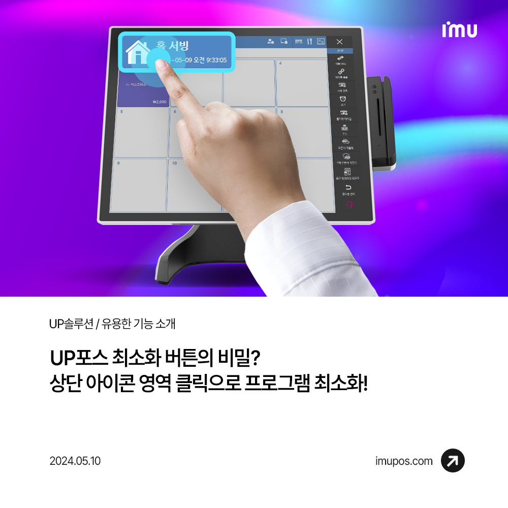 UP포스 최소화 버튼의 비밀?! 상단 아이콘 영역 클릭으로 프로그램 최소화❣ 홀 서빙 화면에서 최소화 버튼을 찾고 있으신가요~?홀서빙 아이콘 영역을 클릭하면 한 번에 최소화 가능하답니다~!테이크아웃 화면도 동일해요상단 아이콘 영역을 클릭하면 최소화 된답니다☺ 상단 아이콘 배치로 배달프로그램, 인터넷 등 다른 응용프로그램과 편리하게 함께 사용 할 수 있어요~!*1.3.042.000 버전 이상에서 사용 할 수 있습니다🤗📢관리 대리점에 업데이트 가능 여부를 꼭~! 확인해주세요 🥰