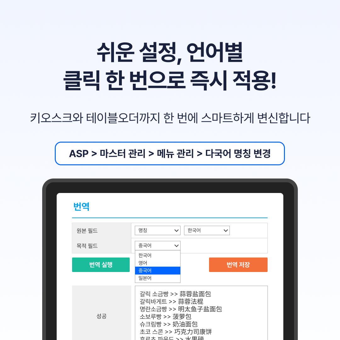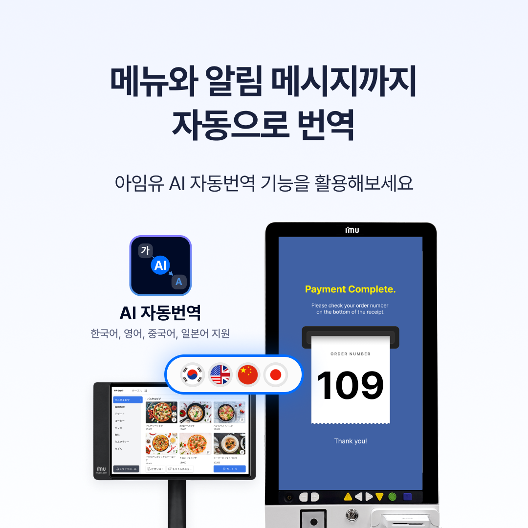 메뉴부터 알림까지 자동 번역으로 외국어 주문도 문제 없이 대응!