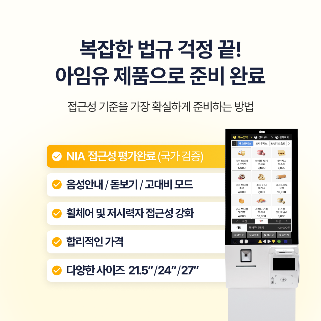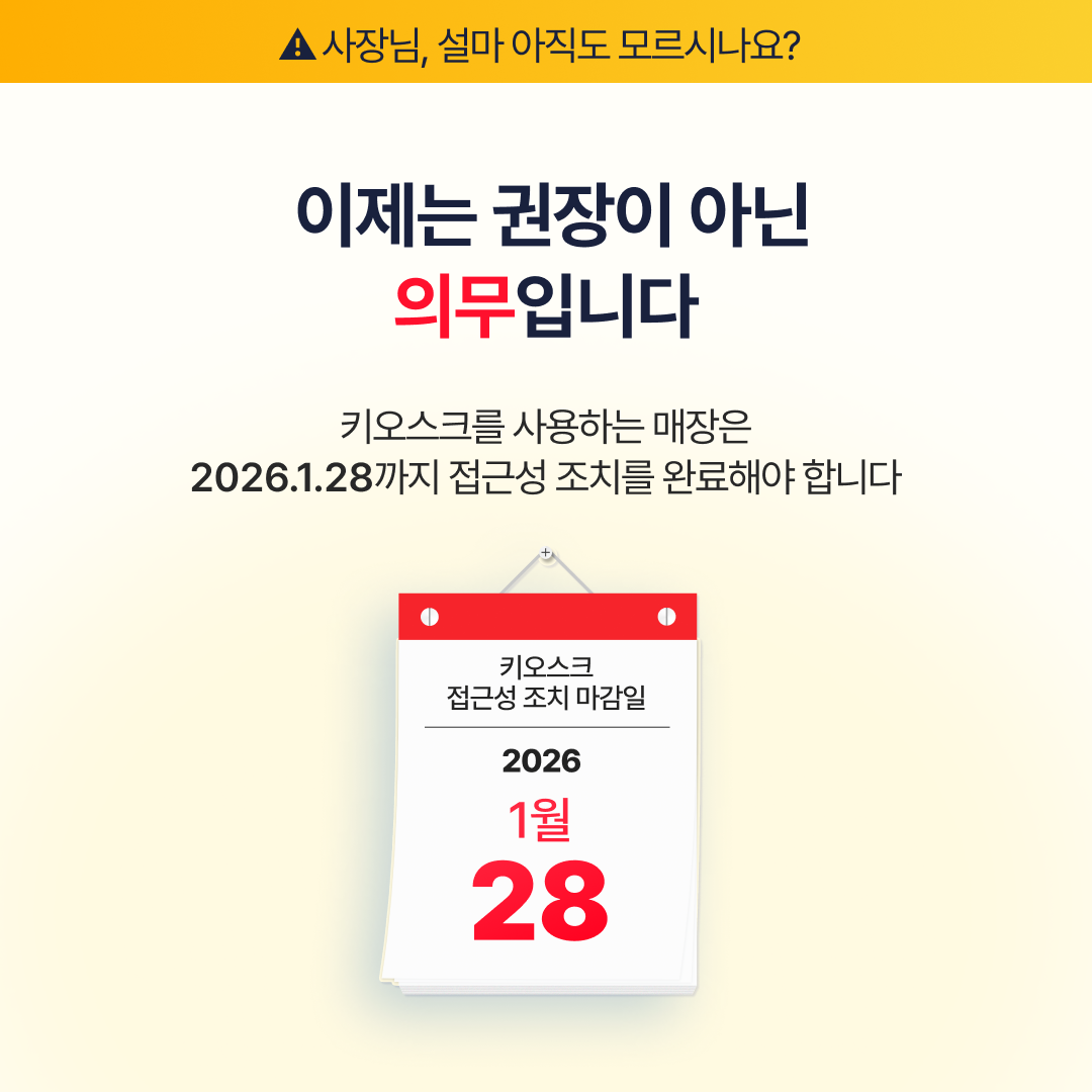 D-26 l 배리어프리 키오스크 의무화 정보2026.01.02 키오스크를 사용하는 매장은2026.01.28까지 접근성 조치를 완료해야 합니다.복잡한 기준, 걱정은 줄이고아임유 배리어프리 키오스크로 설치하세요!#아임유 #키오스크 #아임유키오스크 #배리어프리키오스크 #T6B #장애인차별금지법 #키오스크의무화 #과태료주의 #2026년이슈 목록