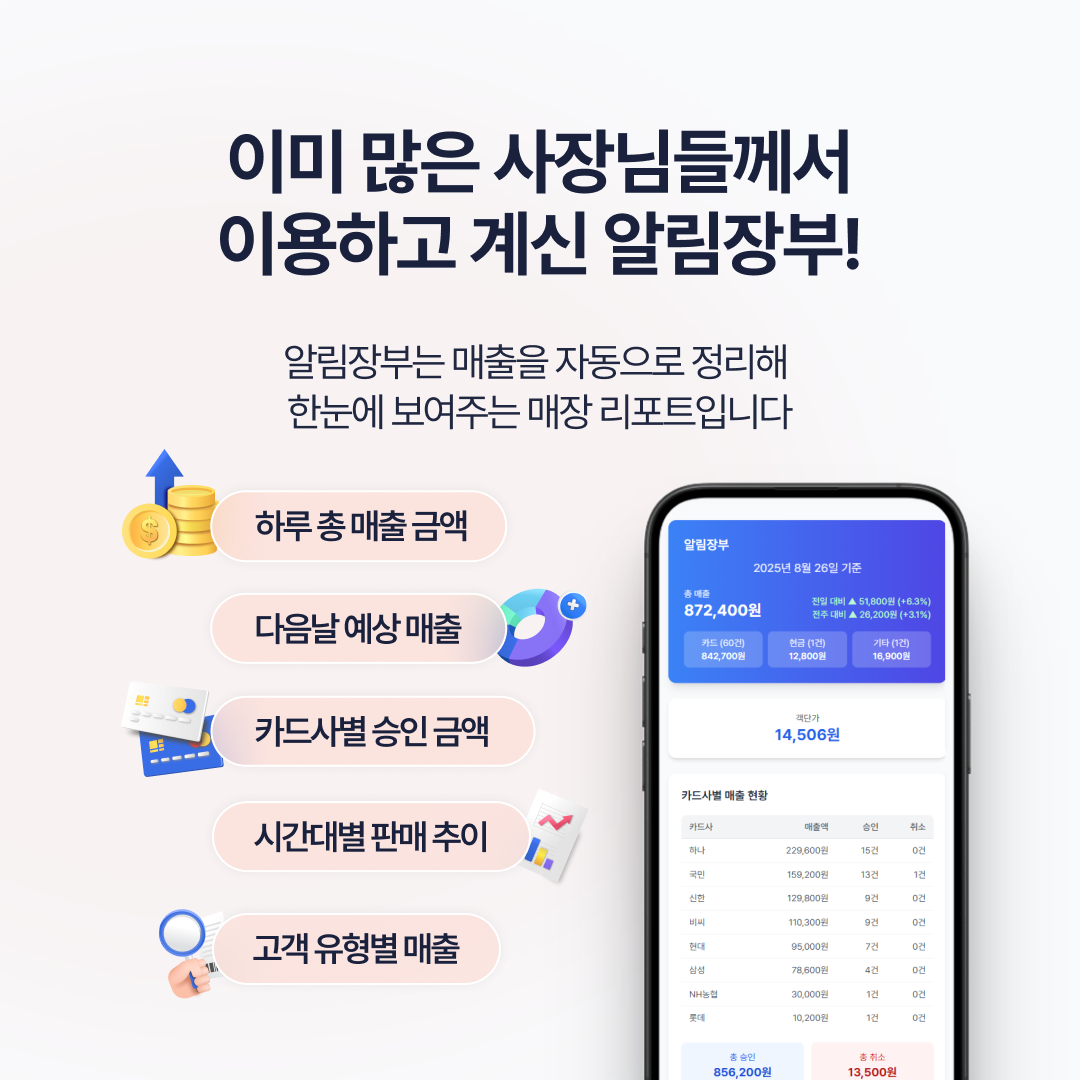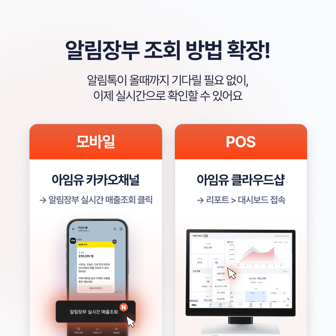 [UPDATE] 알림장부, 이제 실시간으로 확인하세요2026.01.06 ✅ 하루 총 매출 금액✅ 다음날 예상 매출✅ 카드사별 승인 금액✅ 시간대별 판매✅ 고객 유형별 매출까지확인방법① 아임유 카카오채널 ▶ 알림장부 실시간 매출조회 클릭② 클라우드샵 ▶ 리포트 ▶ 대시보드매일 정해진 시간에 받던 매출 리포트,이제 필요할 때 실시간으로 확인하세요#아임유 #아임유포스 #알림장부 #실시간매출 #매장리포트 #사장님리포트 #매출관리 목록