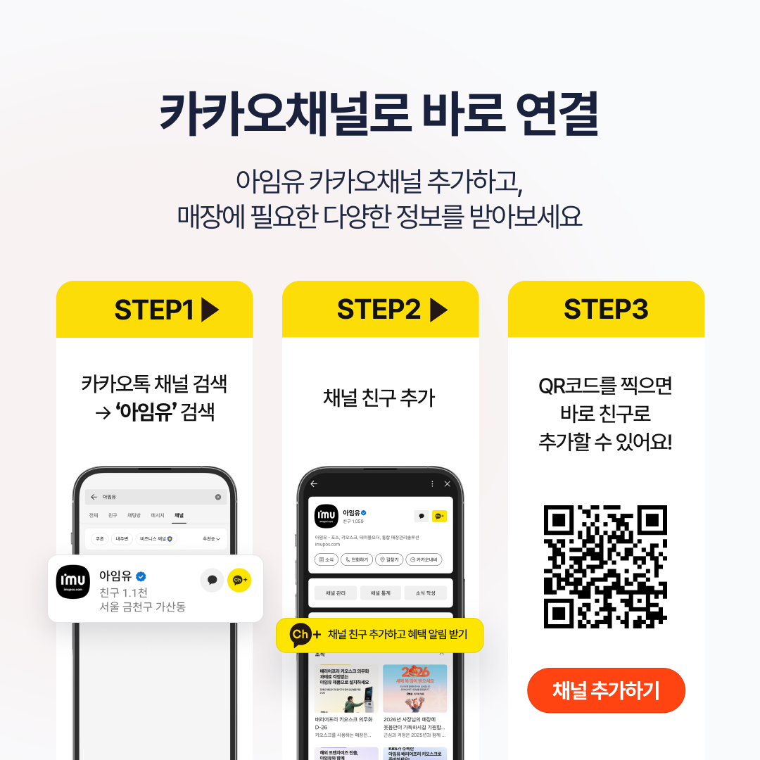IMU 고객서비스 제품 및 서비스에 대한 공지사항을 확인하고 최신 메뉴얼, 드라이버, 홍보물 들을 다운로드할 수 있습니다. [UPDATE] 알림장부, 이제 실시간으로 확인하세요2026.01.06 ✅ 하루 총 매출 금액✅ 다음날 예상 매출✅ 카드사별 승인 금액✅ 시간대별 판매✅ 고객 유형별 매출까지확인방법① 아임유 카카오채널 ▶ 알림장부 실시간 매출조회 클릭② 클라우드샵 ▶ 리포트 ▶ 대시보드매일 정해진 시간에 받던 매출 리포트,이제 필요할 때 실시간으로 확인하세요#아임유 #아임유포스 #알림장부 #실시간매출 #매장리포트 #사장님리포트 #매출관리 목록